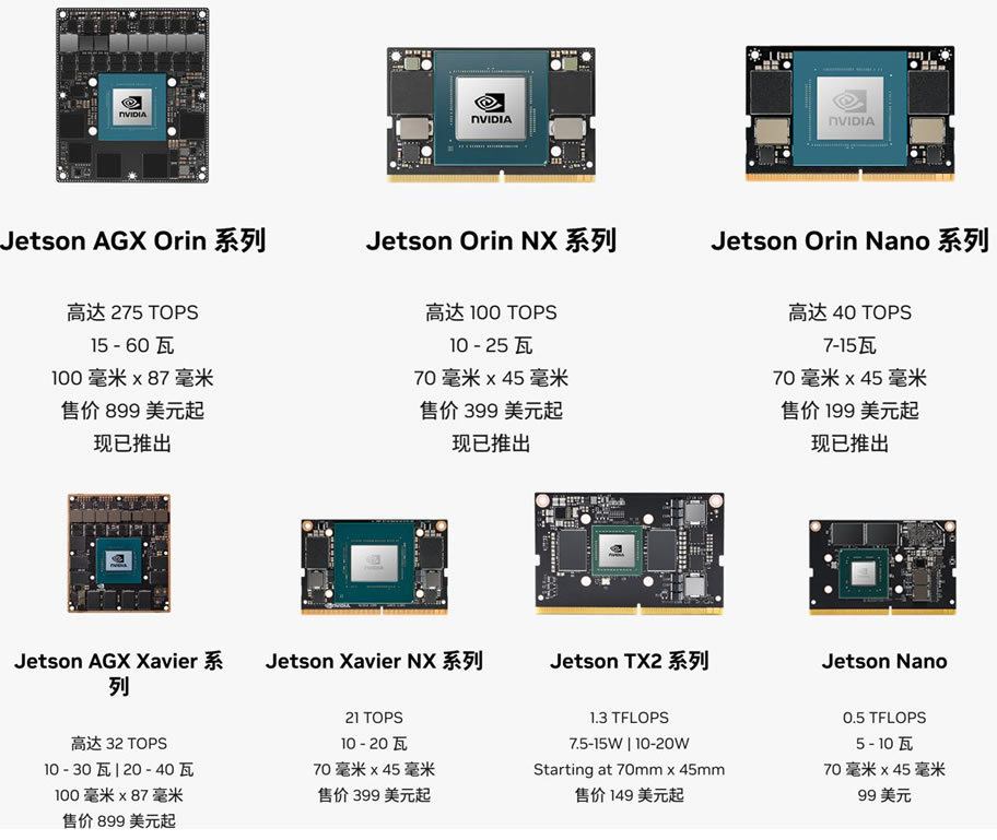 英偉達(dá) Jetson系列是專為機(jī)器人和嵌入式邊緣AI應(yīng)用設(shè)計(jì)的計(jì)算平臺(tái),由Jetson模組、JetPack SDK和生態(tài)系統(tǒng)組成,加速軟件開發(fā)。 Jetson系列的主要成員包括Jetson Nano、Jetson TX2和Jetson AGX Xavier,適用于不同的應(yīng)用場(chǎng)景。Jetson Nano是Z小的設(shè)備,配備了 128核心GPU和四核ARM Cortex-A57 CPU。Jetson Xavier系列模組具有高達(dá)32 TOPS的AI性能,適用于自主機(jī)器的視覺測(cè)距、傳感器融合、 定位和地圖構(gòu)建等應(yīng)用。