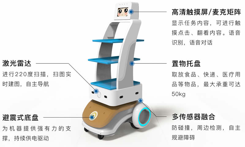 智能配送機器人是一款針對現(xiàn)代化使用環(huán)境開發(fā)的智能機器人。具有自主行走,自主避障,防跌落,自主語音提示、自主充電、防跌落等功能。多載體設(shè)計,適合車站、校園、醫(yī)院、物流、機場、酒店、商場等多場合、多用途使用,在降低人員勞動強度的同時,大幅度節(jié)省運營成本,提G工作效率,提升服務(wù)質(zhì)量,幫助實現(xiàn)工作場景信息化、智能化、科技化、現(xiàn)代化,提供良好的服務(wù)體驗。