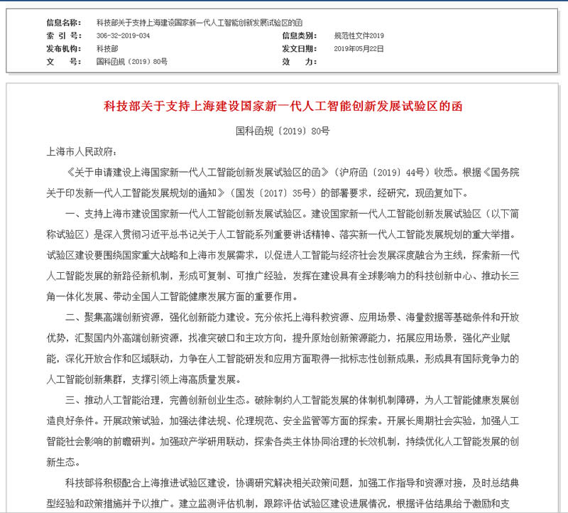 《關于申請建設上海新一代人工智能創新發展試驗區的函》(滬府函〔2019〕44號)收悉。根據《國務院關于印發新一代人工智能發展規劃的通知》(國發〔2017〕35號)的部署要求,經研究,現函復如下。