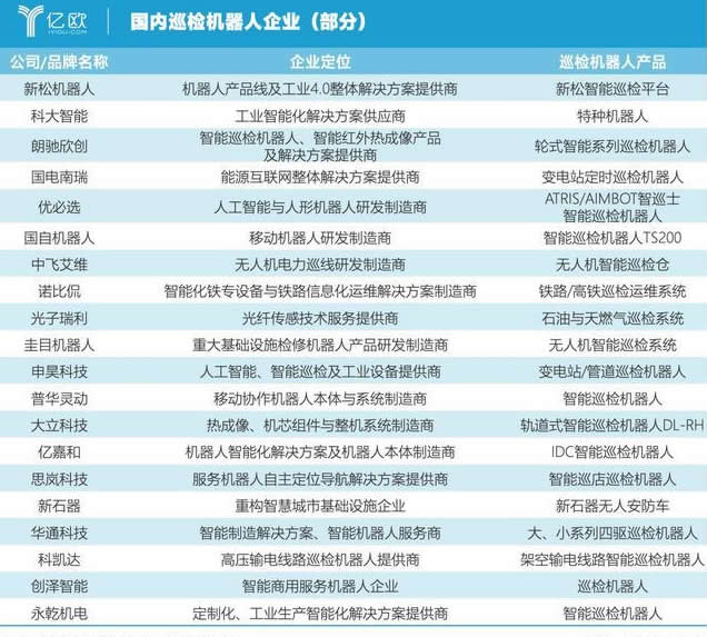 如今,在國內巡檢機器人行業,也已經有眾多玩家參與到其中,他們將巡檢機器人的應用場景由電力場景拓展至管道、橋梁隧道,以及智慧園區、智慧社區、智慧巡警、智慧港口等L域。億歐科創在此梳理了20家巡檢機器人制造商。