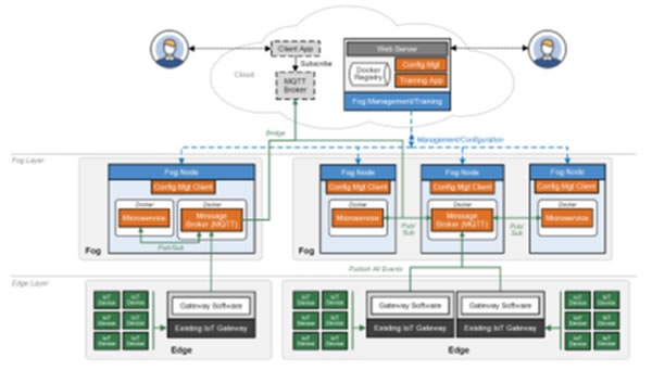 圖2顯示了兩種類型的終端用戶。左邊表示的是那些使用客戶端應用程序的用戶,而用戶使用的應用程序則利用了來自邊緣和霧的數據。應用程序偵聽數據,以某種方式處理數據,并將數據格式化以供用戶查看。右邊的終端用戶是SmartFog管理員,他(或她)負責部署和管理來自云的微服務。