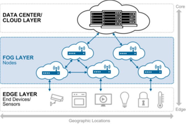霧計算是一種新興的計算范式,它使計算、存儲、網絡、加速、分析和管理控制更接近于網絡的邊緣。它的名字來源于這樣一個事實:云在GG的天空,霧則離地面更近。霧計算的關鍵是,云(或核心中的企業服務器)與物聯網設備之間包含一個霧層,如圖1所示。來自物聯網設備的事件被發送到靠近網絡邊緣的霧節點。