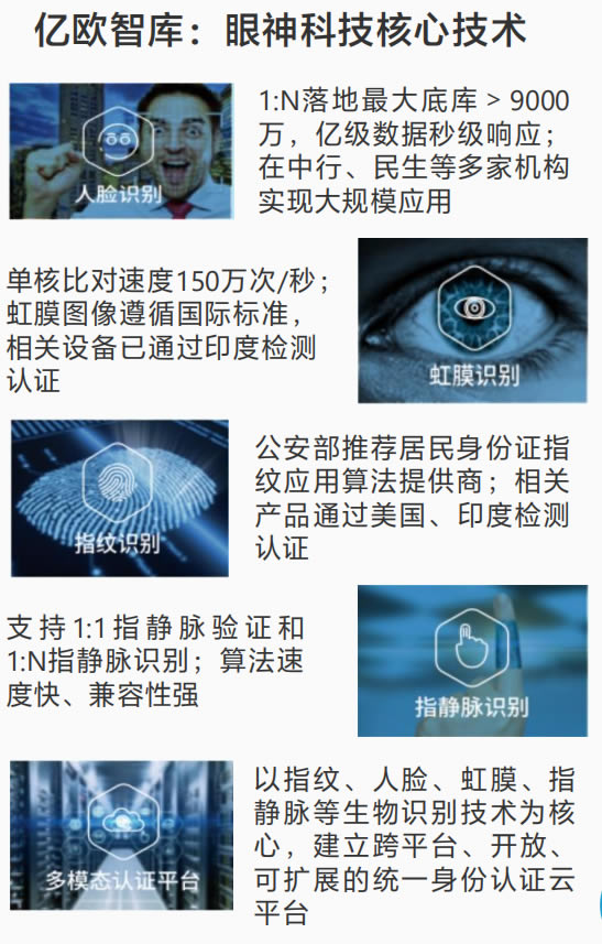 眼神科技是一家AI驅(qū)動的多模態(tài)生物識別技術(shù)解決方案提供商,擁有指紋識別、虹膜識別、人臉識別、指靜脈識別等多種自主知識產(chǎn)權(quán)生物識別技術(shù),并成功打造了多模態(tài)生物識別統(tǒng)一平臺,實(shí)現(xiàn)多場景、多應(yīng)用、多產(chǎn)品、多種識別技術(shù)統(tǒng)一管理。眼神科技基于多模態(tài)生物識別核心算法和統(tǒng)一平臺,賦能合作伙伴,實(shí)現(xiàn)場景落地,已經(jīng)服務(wù)于 2000+客戶,涵蓋了金融、教育、社保、公安、政府、軍隊(duì)以及企事業(yè)單位等多個(gè)L域, 與全國80%以上銀行機(jī)構(gòu)和超過100所G校達(dá)成合作。