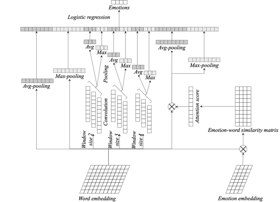 情緒特征抽取:由于獲取的情緒特征是 one-hot 類型,而 one-hot 缺點比較明顯,數據稀疏且無法表示情緒間直接關系。此處我們學習一個情緒 embedding,來更好的表達情緒特征。