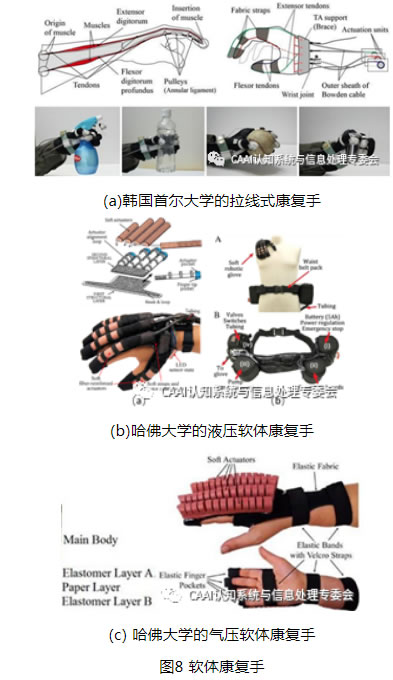 現有的軟體康復手大多采用拉線驅動、液壓驅動和氣壓驅動。韓國首爾大學的HyunKi In等人[10]設計了如圖8(a)所示的一種拉線驅動的軟體康復手Exo-Glove,在柔性織物手套的指套手背側和手掌側鋪設繞性金屬絲,驅動電機拉動繞性金屬絲,即可輔助手指的完成屈曲和伸展動作,指捏力量為20N,掌握力量為40N,驅動控制系統與手套本體分離使手套僅重196g,大可以抓握直徑76mm的物體。哈佛大學的Panagiotis等人[11]設計了如圖8(b)所示的一款重量為285g的輔助患者抓握的液壓驅動的軟體康復手,并配備了一個重量為3.3kg的液壓驅動控制便攜式腰包。該液壓軟體康復手的軟體驅動器,由纖維增強材料制作的成型彈性腔與約束線、限制層組合制作,在增壓時可完成屈曲、扭轉、伸長等運動,可以輔助手指完成主動屈曲運動和被動伸展運動。哈佛大學的Stacey Lyne等人[12]利用3D打印模具進行軟材料澆鑄制作氣動軟體驅動器,從而制作成如圖8(c)所示的重量約為160g的 PneuNet 軟體康復手。該氣動軟體驅動器在靠近手背側嵌入彈性模量大的限制層,使驅動氣腔在增壓時向彈性模型大的一側彎曲,實現輔助手指主動驅動運動,氣壓為0.45Mpa時指尖壓力為1.2N。