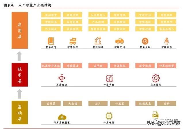 目前,人工智能產(chǎn)業(yè)的生態(tài)系統(tǒng)正逐步成型。依據(jù)產(chǎn)業(yè)鏈上下游關(guān)系,可以將人工智 能劃分為基礎(chǔ)支持層、中間技術(shù)層和下游應(yīng)用層。基礎(chǔ)層是人工智能產(chǎn)業(yè)的基礎(chǔ),主要提 供硬件(芯片和傳感器)及軟件(算法模型)等基礎(chǔ)能力;技術(shù)層是人工智能產(chǎn)業(yè)的核心, 以模擬人的智能相關(guān)特征為出發(fā)點(diǎn),將基礎(chǔ)能力轉(zhuǎn)化成人工智能技術(shù),如計算機(jī)視覺、智 能語音、自然語言處理等應(yīng)用算法研發(fā)。其中,技術(shù)層能力可以廣泛應(yīng)用到多個不同的應(yīng) 用L域;應(yīng)用層是人工智能產(chǎn)業(yè)的延伸,將技術(shù)應(yīng)用到具體行業(yè),涵蓋制造、交通、金融、 醫(yī)療等 18 個L域,其中醫(yī)療、交通、制造等L域的人工智能應(yīng)用開發(fā)受到廣泛關(guān)注。