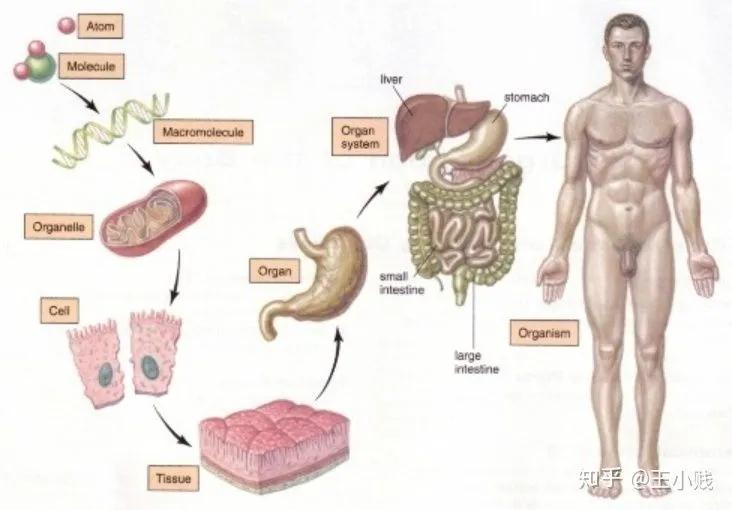 通過上一節(jié)的介紹我們也了解到,深度學(xué)習(xí)的黑箱性主要來源于其G度非線性性質(zhì),每個神經(jīng)元都是由上一層的線性組合再加上一個非線性函數(shù)的得到,我們無法像理解線性回歸的參數(shù)那樣通過非常solid的統(tǒng)計(jì)學(xué)基礎(chǔ)假設(shè)來理解神經(jīng)網(wǎng)絡(luò)中的參數(shù)含義及其重要程度、波動范圍。但實(shí)際上我們是知道這些參數(shù)的具體值以及整個訓(xùn)練過程的,所以神經(jīng)網(wǎng)絡(luò)模型本身其實(shí)并不是一個黑箱,其黑箱性在于我們沒辦法用人類可以理解的方式理解模型的具體含義和行為,而神經(jīng)網(wǎng)絡(luò)的一個非常好的性質(zhì)在于神經(jīng)元的分層組合形式,這讓我們可以用物質(zhì)組成的視角來理解神經(jīng)網(wǎng)絡(luò)的運(yùn)作方式。比如如下圖所示,人體的組成過程是從分子-細(xì)胞-組織-器官-系統(tǒng)-人體: