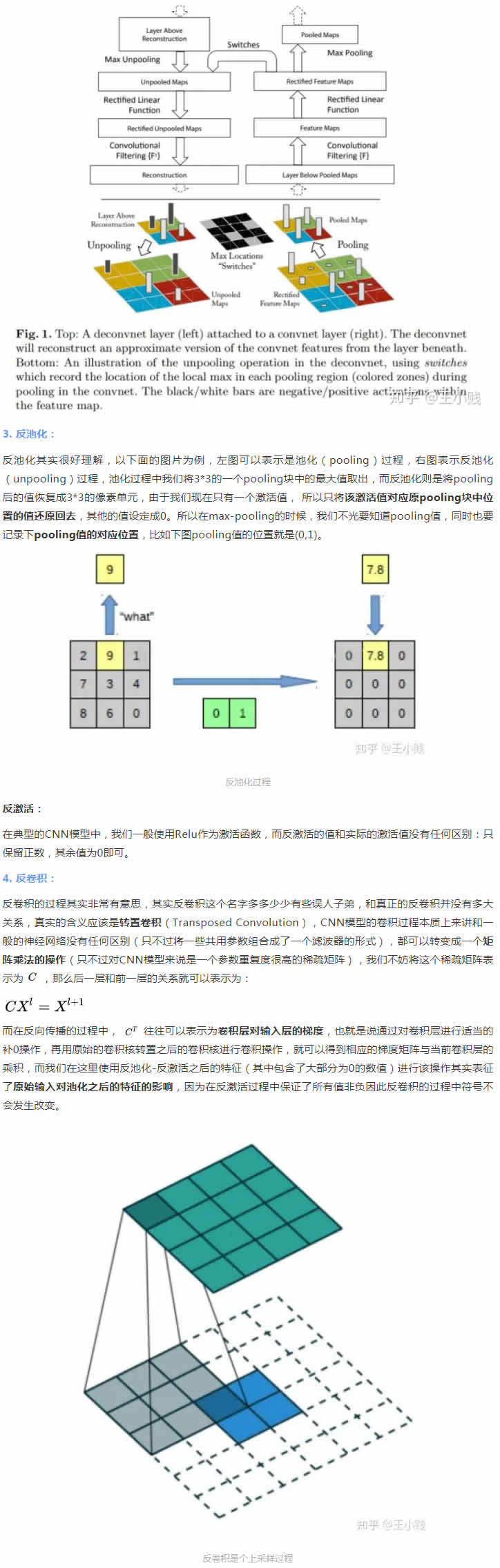 要理解神經(jīng)網(wǎng)絡(luò)中每層都學(xué)到了哪些概念一個非常直觀的方法就是通過對隱層運(yùn)用一些可視化方法來將其轉(zhuǎn)化成人類可以理解的有實(shí)際含義的圖像,這方面一個非常具有代表性的一個工作就是14年ECCV的一篇經(jīng)典之作:《Visualizing and Understanding Convolutional Networks》,這篇文章主要利用了反卷積的相關(guān)思想實(shí)現(xiàn)了特征可視化來幫助我們理解CNN的每一層究竟學(xué)到了什么東西。我們都知道典型的CNN模型的一個完整卷積過程是由卷積-激活-池化(pooling)三個步驟組成的。而如果想把一個CNN的中間層轉(zhuǎn)化成原始輸入空間呢?我們就需要經(jīng)過反池化-反激活-反卷積這樣的一個逆過程。整個模型的結(jié)構(gòu)如下圖所示: