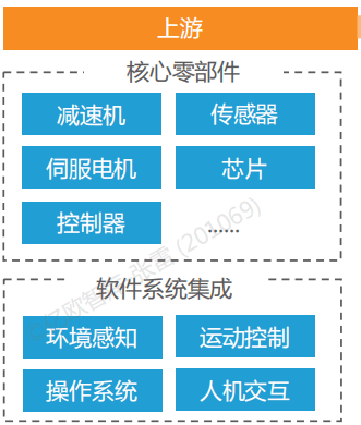 公共服務機器人產業鏈可分為,上游核心零部件、軟件系統開發、中游機器人本體制造、下游機器人分銷商與各場景商業用戶。