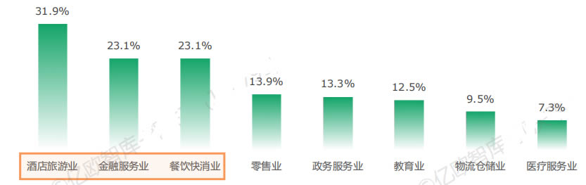 在已使用或計劃使用服務機器人的企業中,酒旅、金融服務、餐飲快消行業滲透率G,均超過20%。在持續了解服務機器人的企業中,倉儲