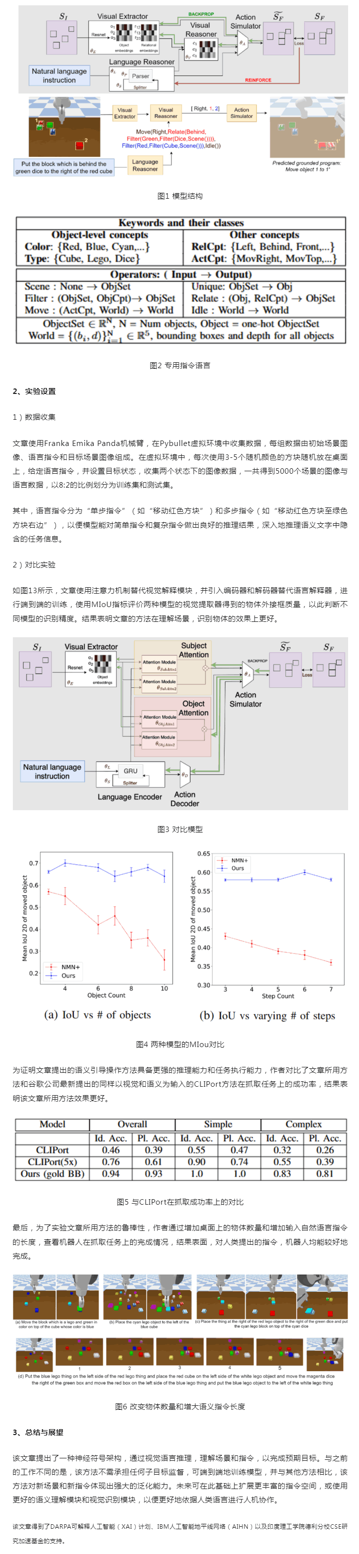 該文章提出了一種新型神經(jīng)符號(hào)模型,使用自然語(yǔ)言推理目標(biāo)場(chǎng)景,實(shí)現(xiàn)在給定初始場(chǎng)景和目標(biāo)場(chǎng)景的情況下即可學(xué)習(xí)執(zhí)行復(fù)雜的操作任務(wù),并展示了如何在不需要任何中間監(jiān)督的情況下,僅使用初始與目標(biāo)兩個(gè)場(chǎng)景作為監(jiān)督來(lái)獲取機(jī)器人操作動(dòng)作的密集表示。 實(shí)驗(yàn)表明,該文章的方法可通過(guò)端到端的訓(xùn)練而不需進(jìn)行任何子目標(biāo)監(jiān)督,即可展現(xiàn)出強(qiáng)大的指令理解能力,并對(duì)新場(chǎng)景和指令展現(xiàn)出強(qiáng)大的泛化能力,為將來(lái)基于自然語(yǔ)言的人機(jī)協(xié)作,機(jī)器人的語(yǔ)義指令集的拓展提供了新的參考思路。