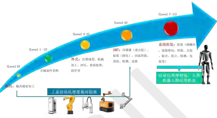1 精密裝配與操作:3C 電子產(chǎn)品如智能手機(jī)、筆記本電腦、智能穿戴設(shè)備等,其內(nèi)部結(jié) 構(gòu)復(fù)雜,包含大量微小精細(xì)的零部件。人形機(jī)器人通過G精度的機(jī)械臂和靈巧手,可以進(jìn)行準(zhǔn)確的抓取、放置、組裝等操作,完成電路板焊接、屏幕安裝、電池固定等精密裝配任務(wù)。