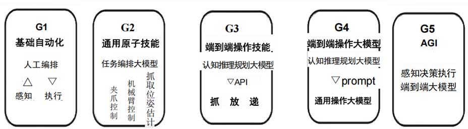 同時(shí),智元還定義了G1 至 G5 的具身智能技術(shù)演進(jìn)路線。G1 主要針對(duì)特定場(chǎng)景;G2 面向更多場(chǎng)景任務(wù), 具有一定的泛化能力;G3 從原先的算法驅(qū)動(dòng)轉(zhuǎn)變?yōu)閿?shù)據(jù)驅(qū)動(dòng);G4 引入了仿真數(shù)據(jù)和世界模型;G5 致力于 從感知到執(zhí)行,具備G度的自主性和適應(yīng)性。目前智元處于G2和G3階段,已在G2路線取得階段性突破, 實(shí)現(xiàn)了UniPose、UniGrasp、UniPlug 的通用原子模型,G3 路線上也形成了全流程具身數(shù)據(jù)方案AIDEA。