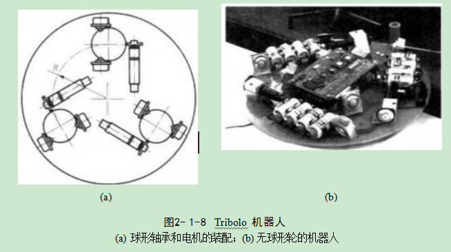 其次,移動機器人底盤的移動方向無直接控制,輪子不對稱的情況會產(chǎn)生各種類型 的誤差。 瑞士聯(lián)邦理工大學(xué)設(shè)計的 Tribolo 是采用3個球形輪的全向驅(qū)動的實例,如圖2-1-8(a) 所示,3個球形輪各由一個電機激勵,3個接觸點將球形輪懸掛起來, 其中2個點由球形軸承給定,另一個由連接到電機軸的輪子給定。這種設(shè)計的機 器人機動性比較好,而且設(shè)計簡單,但是它只適用于平坦的路面和小路,要制造摩擦系數(shù)大的圓形輪子是十分困難的。
