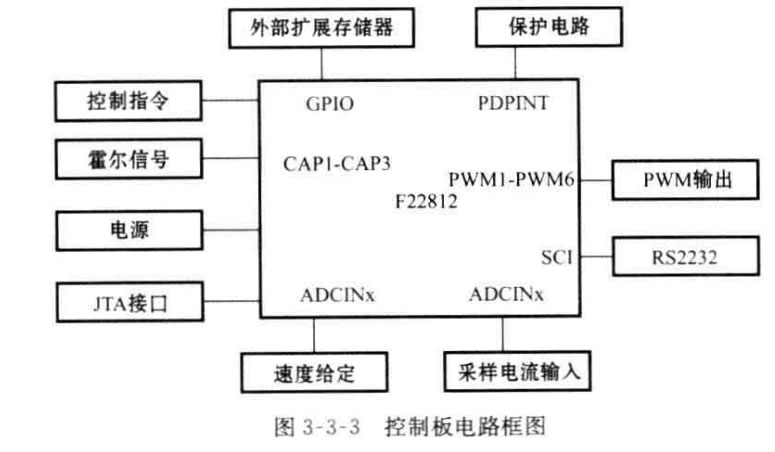 系統(tǒng)的硬件框圖如圖3-3-2所示,可以看出基本上包括一個(gè)以TMS320F2812DSP 為核心的DSP 控制板,一塊配套的功率驅(qū)動(dòng)板和一臺(tái)無(wú)刷直流電機(jī)。實(shí)現(xiàn)的 主要功能是控制指令的接收和執(zhí)行,速度信號(hào)的接收和計(jì)算處理,電流采樣信號(hào)接 收和轉(zhuǎn)換,速度閉環(huán)和電流閉環(huán)控制算法的執(zhí)行等。