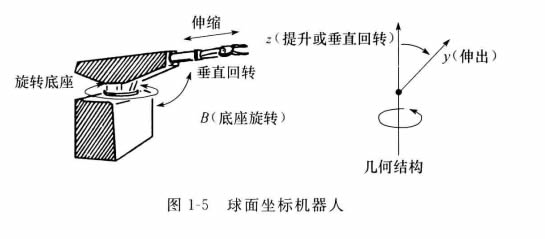 這種機器人如圖1-5所示。它像坦克的炮塔一樣,機械手能夠做里外伸縮移動、在垂直平面上垂直回轉以及在水平平面上繞底座旋轉。因此,這種機器人的工作包跡形成球面 的一部分,并被稱為球面坐標機器人。