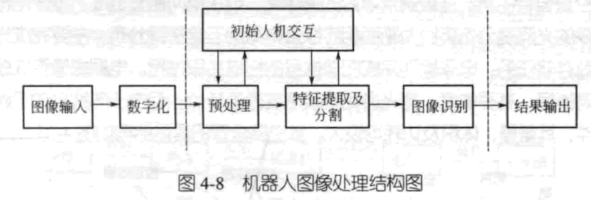 ③處理結果輸出(機機接口和人機接□):識別信息的輸出是圖像處理的 Z終目的。從廣義的角度講,信息的輸出形式可分為兩種:一種是根據(jù)識別的結 果作出判斷,通常以符號信息的形式輸出;另一種是以圖像形式輸出。機器人圖 像處理的結構圖如圖4-8所示。