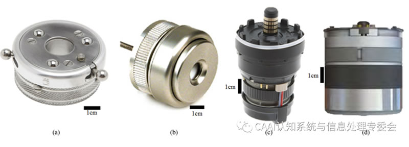 主動單自由度腕部通常在假肢和機器人應(yīng)用中都能找到。在假肢L域,這些系統(tǒng)通常與EMG系統(tǒng)一起使用,使用戶能夠通過肌肉信號控制旋轉(zhuǎn)。活動手腕可以是獨立的單元集成到假手中,或者集成到較大假手中的前臂中。與被動手腕類似,主動單自由度裝置也可分為旋轉(zhuǎn)器和屈肌。主動旋轉(zhuǎn)器是腕部假體中常見的動力裝置。獨立設(shè)備包括運動控制電動旋轉(zhuǎn)器和OB腕部旋轉(zhuǎn)器,如圖(c)所示,這兩種設(shè)備都是為與許多終端設(shè)備兼容而設(shè)計的,因而得到了相對廣泛的應(yīng)用。OB-Michelangelo手和TBi-Limb Quantum都使用緊湊的旋轉(zhuǎn)器,即軸旋轉(zhuǎn)和俯臥旋轉(zhuǎn)[圖(d)],它們分別安裝在各自手的假體窩和下手掌中,主動屈肌也往往納入現(xiàn)有的機器人手或終端設(shè)備系統(tǒng)。