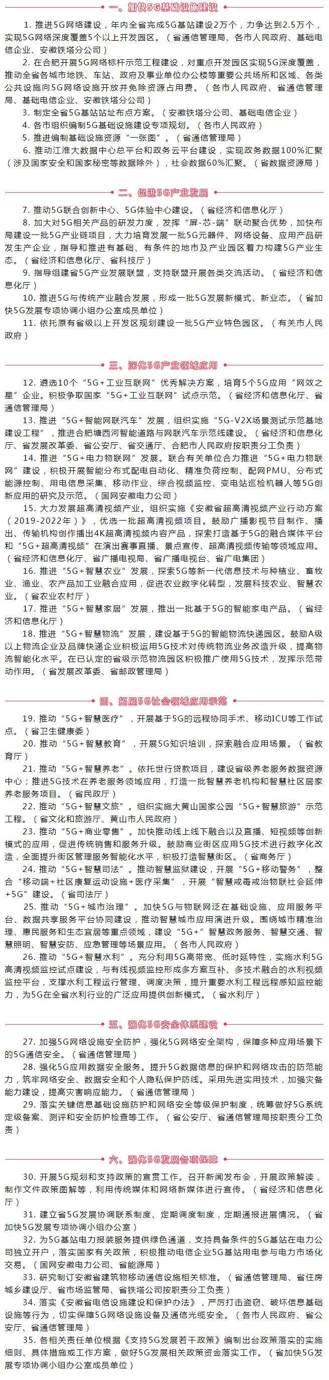 保障措施六個方面對本市5G發展做出規劃,多面考慮本市優勢和不足,提出主要任務為“一、實施‘一五六六’行動計劃;二、實施創新能力提升工程