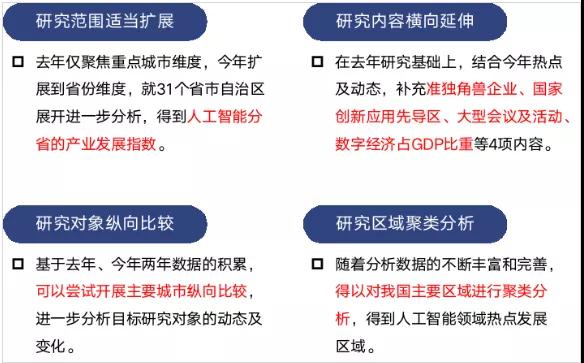 變化及亮點(diǎn)方面,今年AI指數(shù)在研究范圍、研究?jī)?nèi)容、研究對(duì)象、研究區(qū)域等維度均進(jìn)行了豐富和完善,包括從僅分析市級(jí)維度擴(kuò)展到省級(jí)維度、增加國(guó)家創(chuàng)新應(yīng)用先導(dǎo)區(qū)等指標(biāo)、增加年度縱向比較和區(qū)域聚類分析等,可以說(shuō)亮點(diǎn)紛呈。