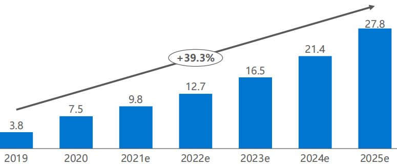 受新G疫情的防疫需求帶動,加之清潔行業長期面臨招工難、人力成本G等 痛點,商用清潔機器人的市場需求愈發旺盛。特別是具備智能消毒功能的清 潔機器人,通過集成消毒液自動噴灑系統,實現全域噴霧消殺,可以有效降 低人力工作強度和交叉感染風險,已在地鐵站、機場、辦公區、展館、酒店 等場景加速落地應用。在需求驅動下,商用清潔機器人的市場規?焖僭鲩L。 2019年中國商用清潔機器人的市場規模約3.8億元,預計2021年將達到9.8 億元,2025年將達到27.8億元,年復合增長率約39.3%*。