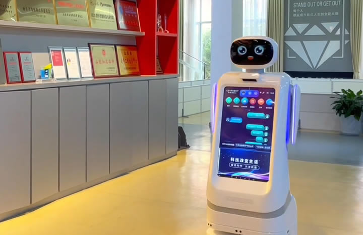 前臺(tái)接待機(jī)器人為多種類型的單位(如餐廳,商場(chǎng),展廳,接待室,機(jī)場(chǎng),車站,圖書館,學(xué)校等)完成前臺(tái)接待工作,按照設(shè)置好的路線提供講解服務(wù),隨時(shí)解答訪客提出的相關(guān)問題