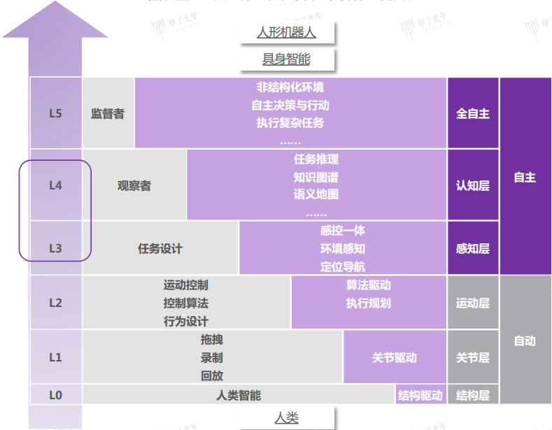 第三代為智能機器人(L4-L5):擁有更豐富的傳感器和更G的智能水平,不僅能獲取并處理外部綜合信息,甚至能據此自己制定行動目標,其智能主要體現在感知交互、獨立決策、自我優化三個方面。