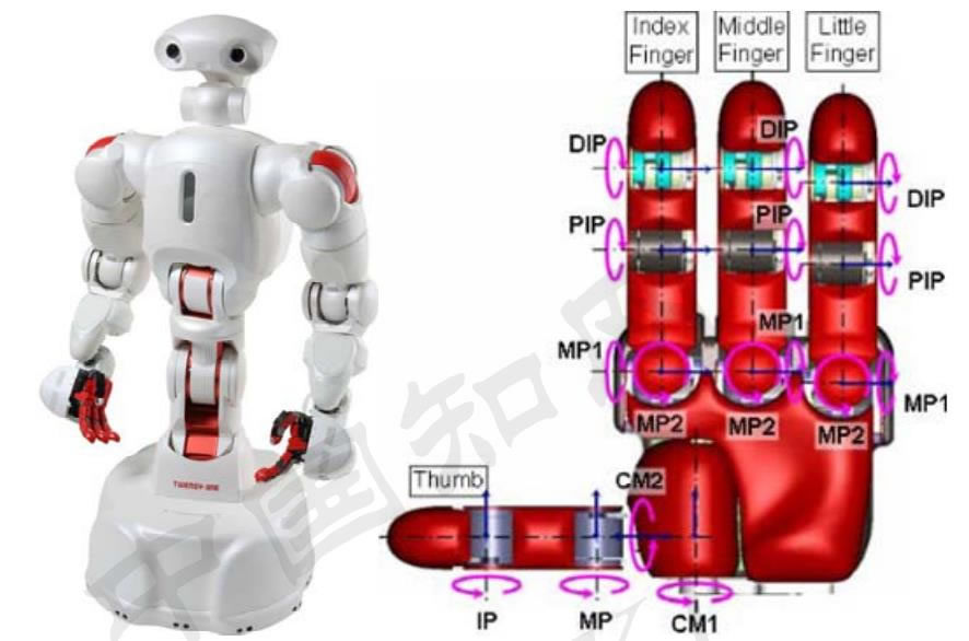 因此,我們定義靈巧手是指數(shù)≥3,自由度≥9 的末端執(zhí)行器。例如日本的 TWENDY-ONE 機(jī)器人,其靈巧手擁有 4 根手指和 13 個(gè)自由度。
